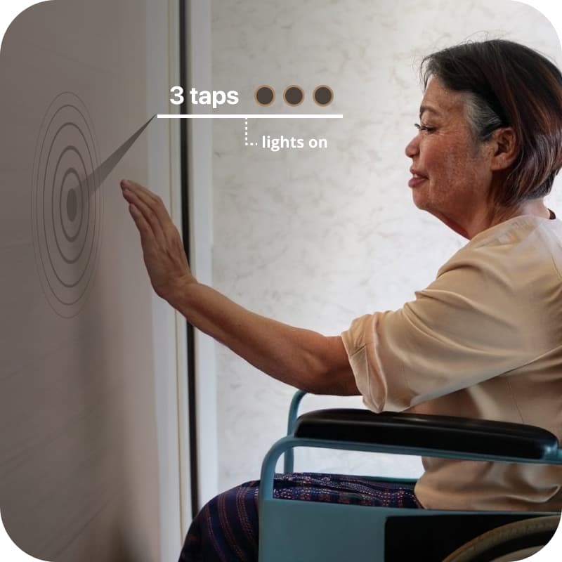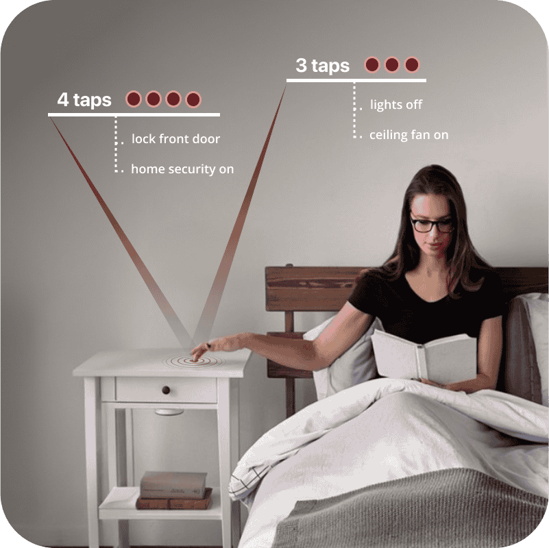 Physical buttons and switches must be within physical reach in order to be used. Knocki turns an entire surface into a remote control, so you can trigger actions from anywhere, without needing to visually or physically locate a specific spot. (Also great for kids, physically impaired, and elderly who can’t reach a switch).